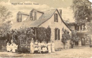 Frederich Christian Meyer, a native of Germany, came to Comfort only three years after the founding of the town. He and his wife bought property along Cypress Creek and on the old road to San Antonio. They enlarged their home in 1869 and this became an obvious place for a stage stop. A second house was built for Mrs. Meyer to use as a maternity hospital as she was a midwife to her neighbors. Yet another building was added to house overnight travelers.
