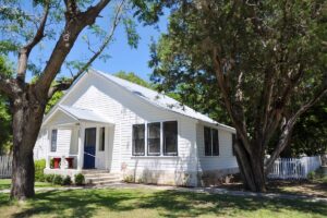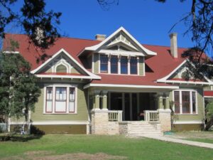 This large charming residence was built in 1910 by Mrs. Emilie Hugo of San Antonio. Oral history states this was a Sears & Roebuck Company pre-fabricated home. It was delivered in pieces and assembled by their craftsmen. The stated cost was $5,000. In 1919, Otto Holekamp bought the house, and it stayed in the family until 1976, and it was sold to Roy Matter. Later in 2003, it was purchased by John & Mary Straley. They renovated the home and added 6 private bathrooms for each of the 6 bedrooms and ran a Bed and Breakfast. Previous owners, Joe and Ella Gay, remodeled the 108-year-old home, and opened as a guesthouse under the name Holekamp Guest Haus. The home, consisting of long leaf pine floors and high ceilings, was built for a large family and their guests. This Sears & Roebuck kit home, shows the original facade, consisting of hints of both Moorish and Victorian design features with bay windows on each side surmounted by gable details. It has a massive central dormer echoing similar gable details. The home consists of 2 stories, a basement, 3 fireplaces and a porte cochere attached covered drive-thru for carriages. The residence also boasts a large updated kitchen, butler’s pantry, owner’s suite and a large utility store room. Beautiful period chandeliers and lighting fixtures adorn each room. Large ornately carved armoires and unique beds enhance the grandeur and mystique in the six large bedrooms. The second floor affords an imposing view of Comfort and the surrounding hills from both the inside and the side balcony above the porte cochere. The house continues as a Bed and Breakfast to this day.